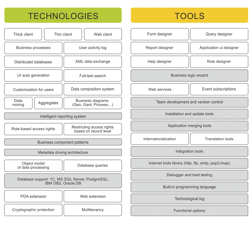 • There is a great number of business applications developed on 1C:Enterprise platform. More than 500 solutions for vertical markets have been developed by 1C partners worldwide: transportation, public health, educational institutions, agriculture, public catering, insurance, non-profit organizations, manufacturing, tourism, service industry and many others.